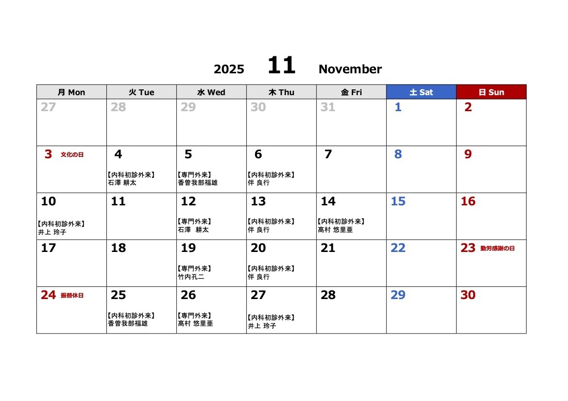 今月の新患外来スケジュールと担当医をご案内します